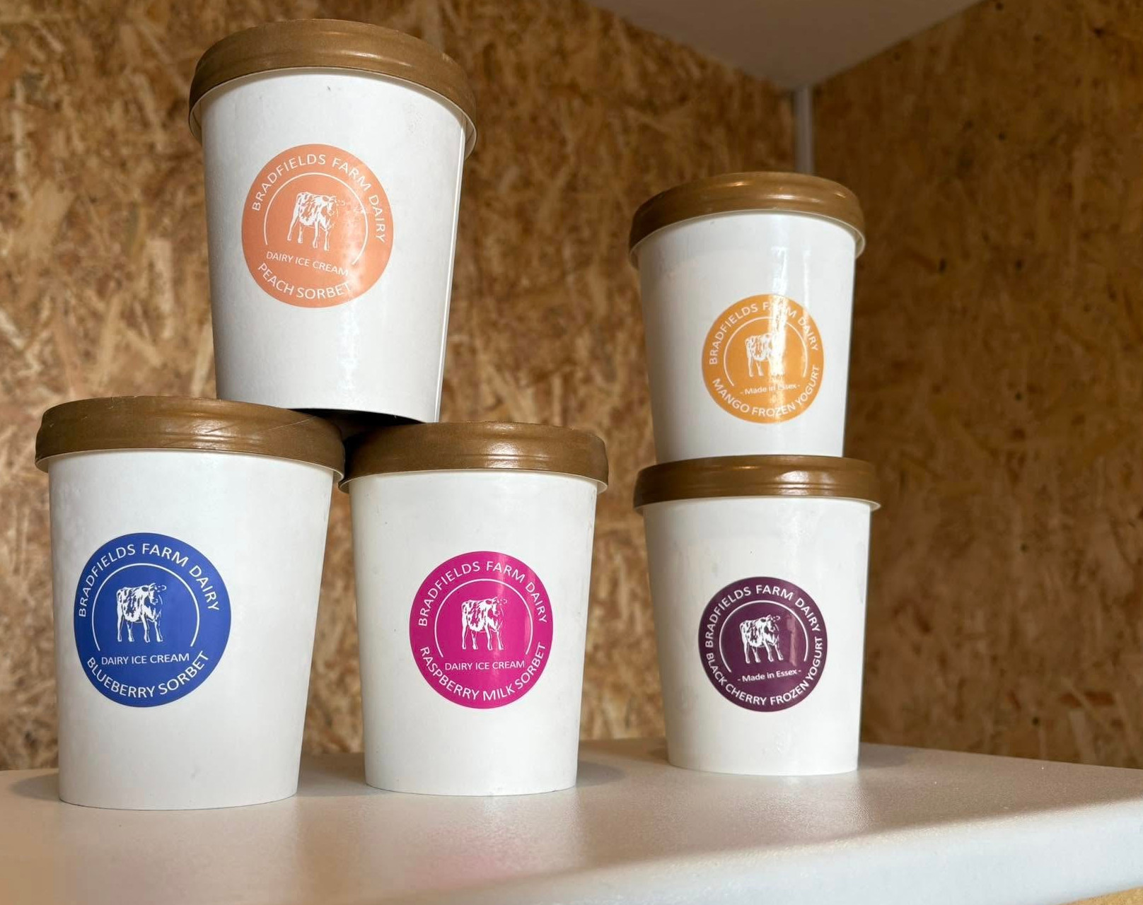 We make dairy ice cream, frozed yogurts and sorbets on the farm from our own fresh milk and cream. They are available in 500ml tubs all year round as well as in cones or small tubs during the summer months.
